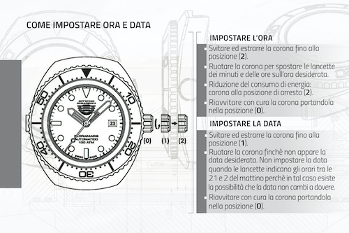 Non azionare la corona quando l’orologio è immerso.In presenza di corona a vite che ne blocca lo scorrimento, svitarla per utilizzarne la funzionalità.